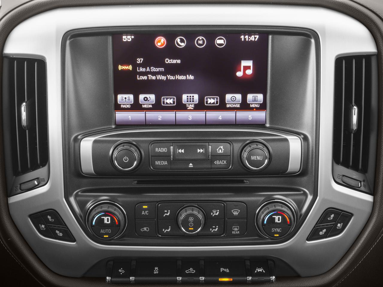 SLT CREW CAB PREMIUM PLUS PACKAGE Includes (NZP) 20 chrome clad wheels, (QSS) P275/55R20 all-season, blackwall tires, (UD5) Front and Rear Park Assist, (UVD) heated steering wheel, (A48) power sliding rear window, (BVQ) 6 rectangular chrome tubular assist steps, (UQA) Bose premium audio system, (IO6) IntelliLink 8 Diagonal Color Touch audio system with Navigation, (JL1) trailer brake controller, (Y86) Enhanced Driver Alert Package, (AN3) front bucket seats, (KQV) heated and vented seating, (CGN) spray-on bed liner and (T4L) full LED headlamps. ENHANCED DRIVER ALERT PACKAGE includes (UHX) Lane Keep Assist, (TQ5) IntelliBeam headlamps, (UHY) Low Speed Collision Mitigation Braking, (UD5) Front and Rear Park Assist and (UEU) Forward Collision Alert, Safety Alert Seat, SEATING, HEATED AND VENTILATED PERFORATED LEATHER-APPOINTED FRONT BUCKET, SEATS, FRONT FULL-FEATURE LEATHER-APPOINTED BUCKET with (KA1) heated seat cushions and seat backs. Includes 10-way power driver and front passenger seat adjusters, including 2-way power lumbar control, 2-position driver memory, adjustable head restraints, (D07) floor console and storage pockets. (Includes (K4C) wireless charging. AUDIO SYSTEM, 8 DIAGONAL COLOR TOUCH SCREEN NAVIGATION WITH INTELLILINK, AM/FM/SIRIUSXM, HD RADIO with USB ports, auxiliary jack, Bluetooth® streaming audio for music and most phones, Pandora Internet radio and voice-activated technology for radio and phone, ENGINE, 5.3L ECOTEC3 V8, WITH ACTIVE FUEL MANAGEMENT, DIRECT INJECTION and Variable Valve Timing, includes aluminum block construction (355 hp [265 kW] @ 5600 rpm, 383 lb-ft of torque [518 Nm] @ 4100 rpm; more than 300 lb-ft of torque from 2000 to 5600 rpm) (STD), TRANSMISSION, 8-SPEED AUTOMATIC, ELECTRONICALLY CONTROLLED with overdrive and tow/haul mode. Includes Cruise Grade Braking and Powertrain Grade Braking, STEERING WHEEL, HEATED, LEATHER WRAPPED with audio and cruise controls.