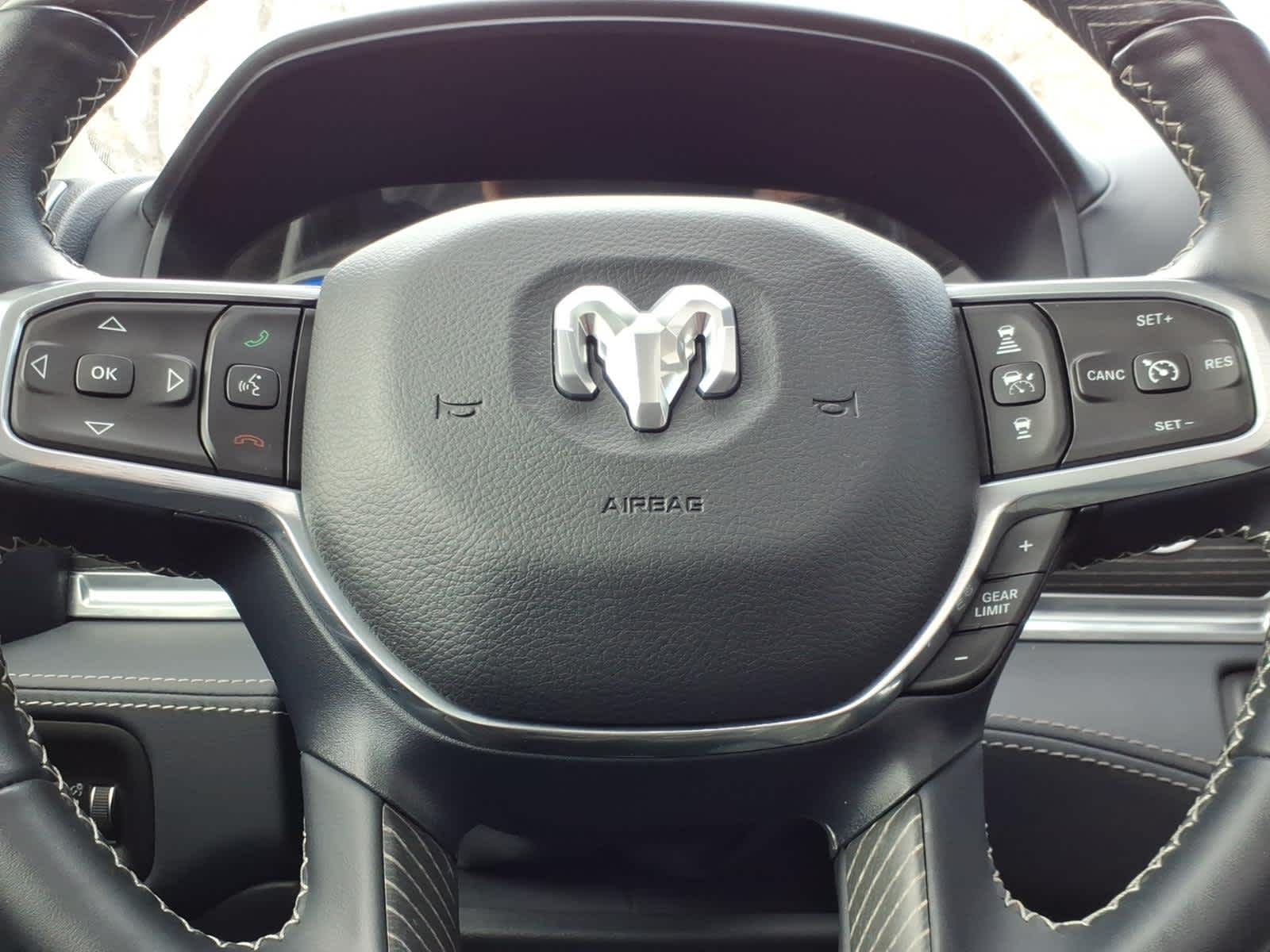 Leather Seats, Navigation, 4x4, Heated Driver Seat, Cooled Driver Seat Ram Limited with Ivory White Tri-Coat Pearlcoat exterior and Indigo/Sea Salt interior features a V6 Cylinder Engine with 395 HP at 5600 RPM*.